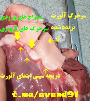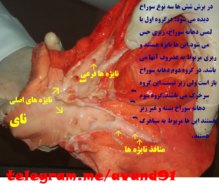 3- با برش نای در سمت راست شش ها یک نایژه فرعی می بینیم که به یکی از لب های شش راست می رود.