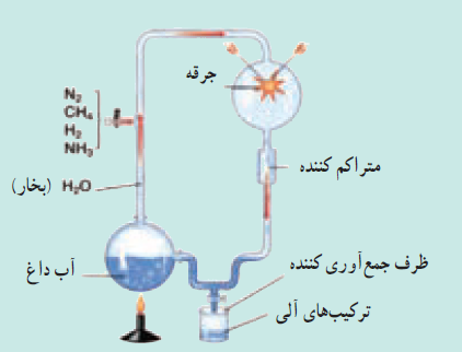 اولین بار استانلی میلر(Stanley Miller)با طراحی آزمایشی این فرضیه را آزمایش کرد. میلر، مخلوطی از گازهای آمونیاک، هیدروژن،نیتروژن، بخار آب و متان(N2 ,NH3, H2, H2O, CH4 ) در درون دستگاهی قرار داد(شکل زیر) و به منظور شبیه سازی رعد وبرق از جرقه الکتریکی استفاده کرد. او پس از چند روز ترکیبات متعددی در این دستگاه پیدا کرد. میلر مواد تولید شده را از طریق تله سرد(trap) از دستگاه خارج می کرد.