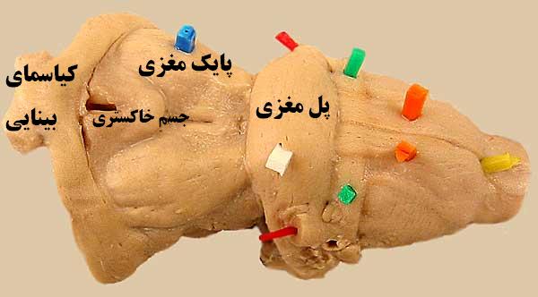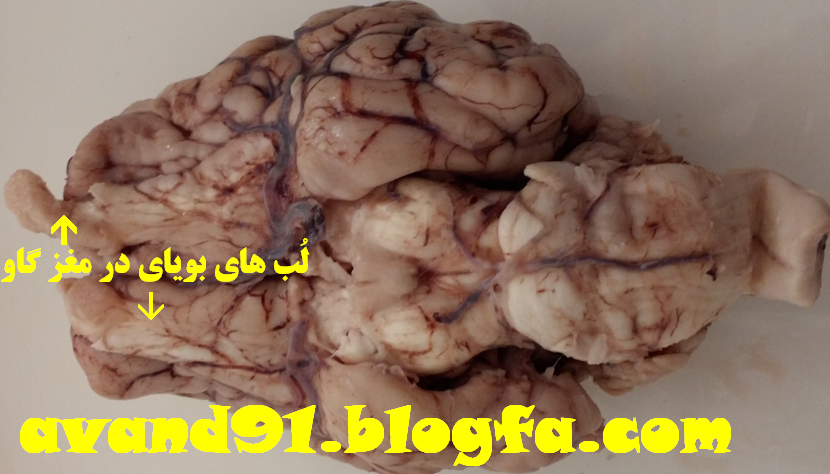 در تشریح مغز سطح پشتی و شکمی مغز را مشخص می کنیم. سطح پشتی که برجسته تر است. در سطح پشتی گوسفند و گاو دو نیمکره و شیار طولی بین آن ها، مخچه، کرمینه، بخشی از نخاع و قسمت های از لُب بویایی دیده می شود.بر روی قسمت های مختلف مغز باقیمانده پرده مننژ، یعنی نرم شامه و قسمت های از عنکبوتیه دیده می شود.که هنگام جدا سازی قسمت های مربوط به نرم شامه لایه مانند و قسمت عنکبوتیه شبکه مانند است. رگ های زیادی در این قسمت دیده می شود.