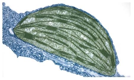 ریزنگاری که پیچیدگی درون کلروپلاست را به خوبی نشان می دهد.قسمت های آبی رنگ سیتوزول می باشد